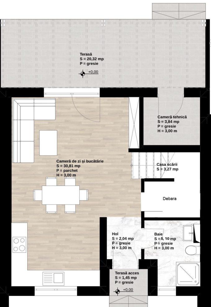 - Terasa mare, de peste 20 de mp, acoperită cu gresie porțelanată pentru exterior, rezistentă la intemperii