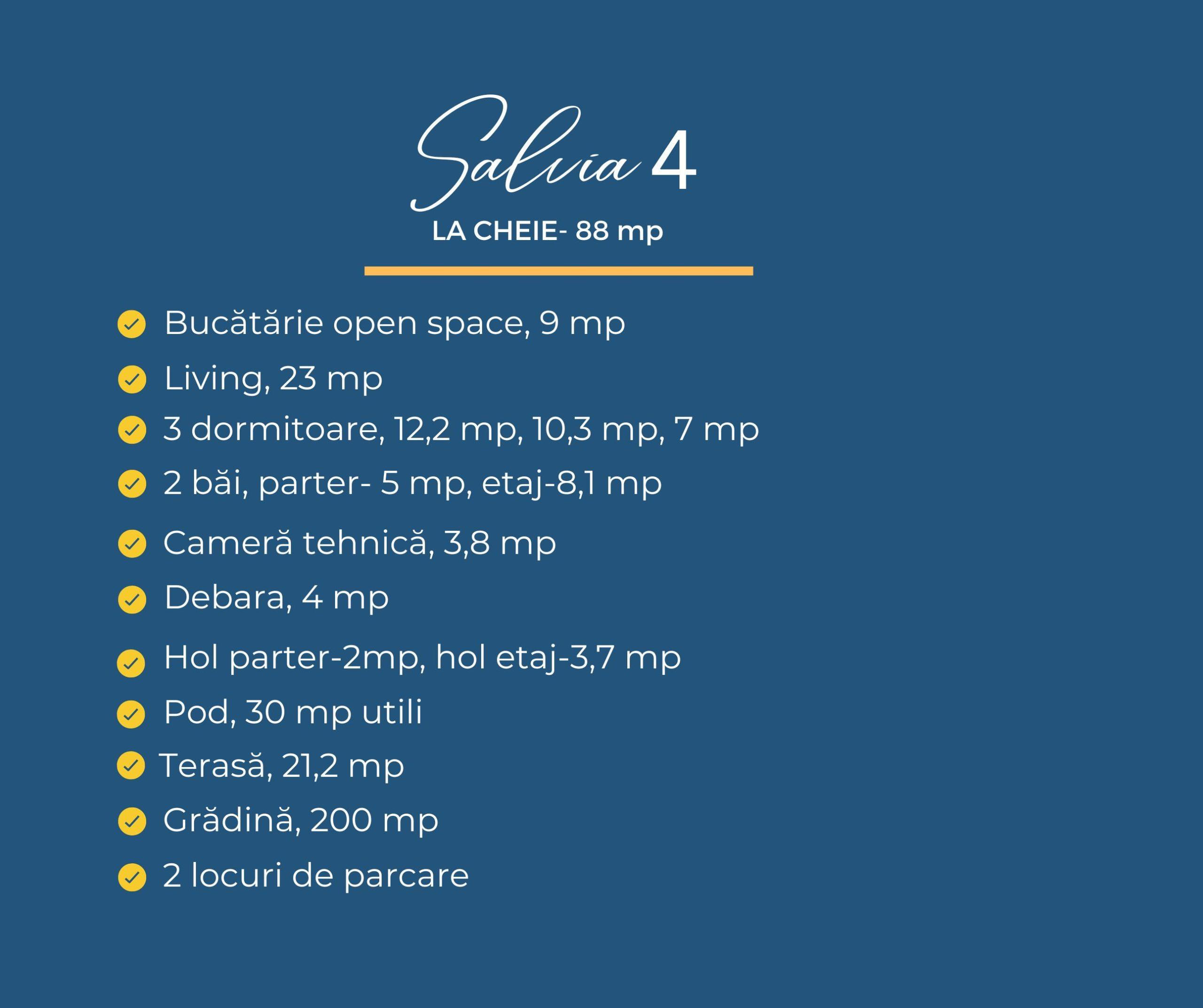 Casa SALVIA 4 face parte dintr-un ansamblu de 4 case înșiruite, din noul complex rezidențial SALVIA-RESIDENCE, compus din 17 unități locative. Este situată în imediata vecinătate a Timișoarei, aproape de Calea Urseni, pe strada Salviei, localitatea Giroc, județul Timiș.