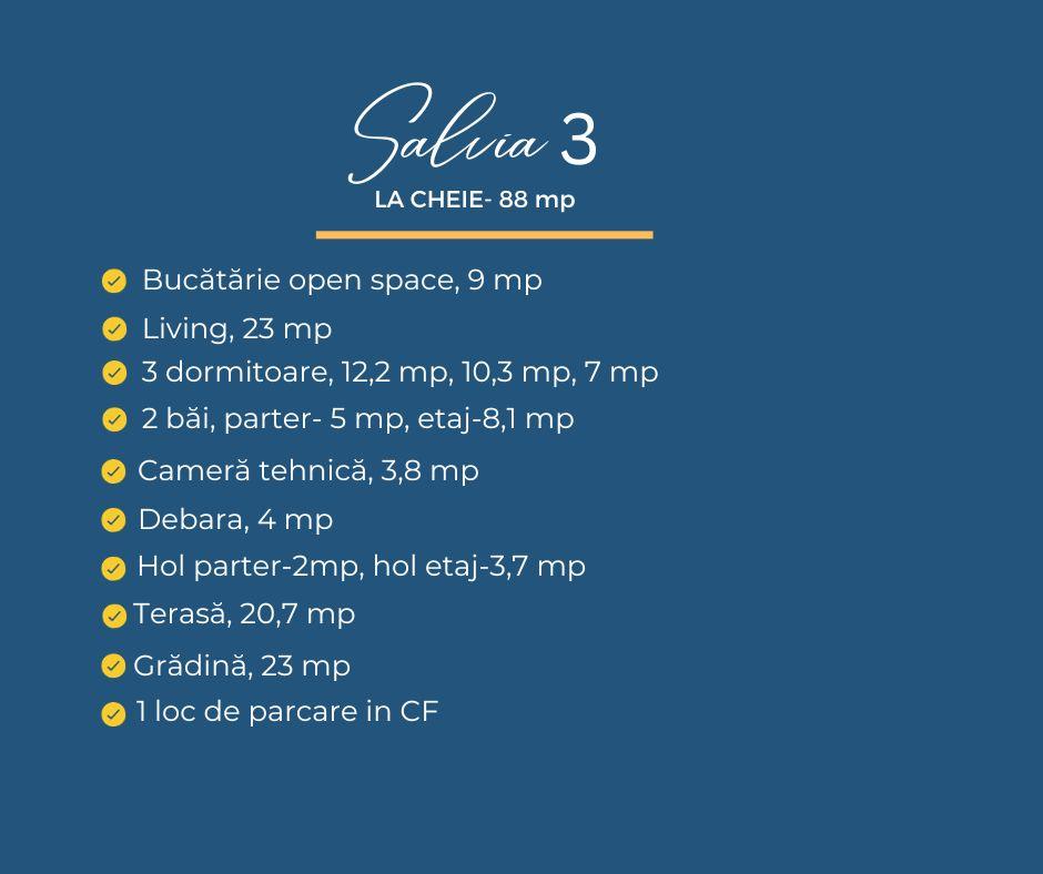 Casa SALVIA 3 face parte dintr-un ansamblu de 4 case înșiruite, din noul complex rezidențial SALVIA-RESIDENCE, compus din 17 unități locative. Este situată în imediata vecinătate a Timișoarei, aproape de Calea Urseni, pe strada Salviei, localitatea Giroc, județul Timiș.