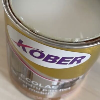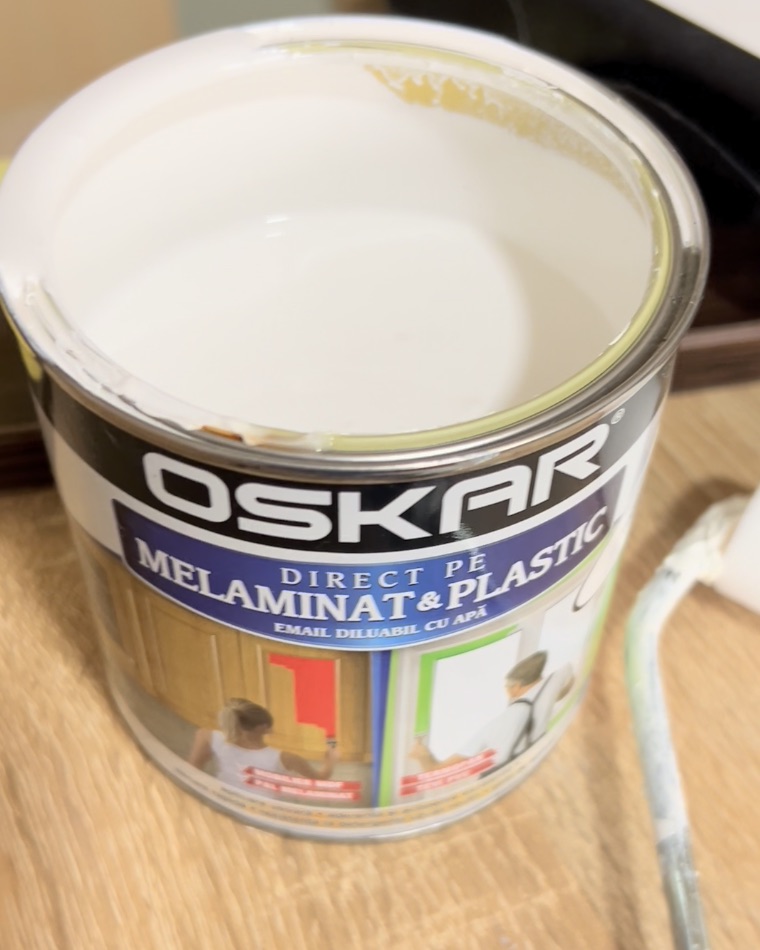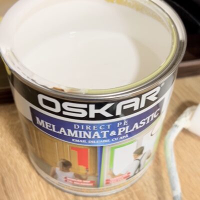 Dupa ce am curatat-o bine de praf, am aplicat mai multe straturi de vopsea Oskar pentru melaminat. Nu am folosit grund. Am dat vreo 4 straturi, cu uscare intre ele. ATENTIE! Pare uscata destul de repede, nu manevrati insa piesele vreo cateva zile, ca se zgaraie usor. Dupa uscarea in profunzime, rezista insa foarte bine. Am mobila vopsita asa de cativa ani si e intacta.