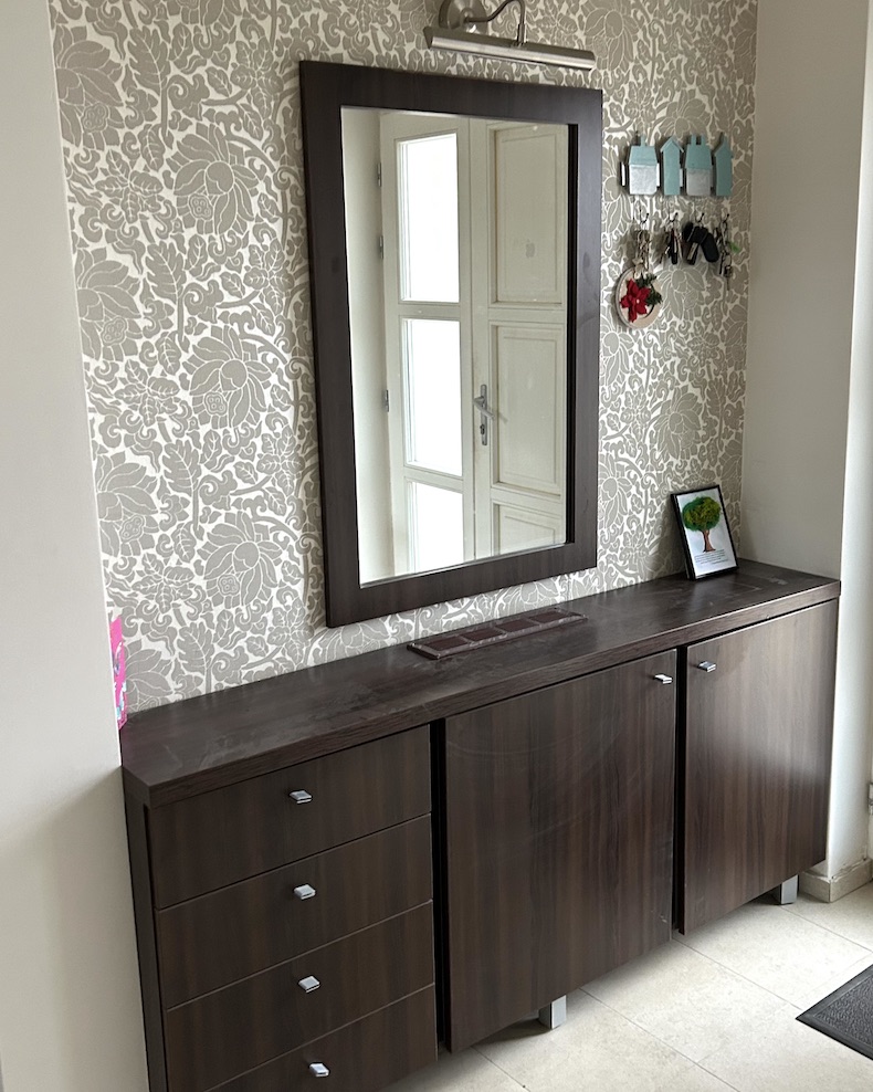 Pe hol, renovarea a fost insa mai ampla. Am dat jos tapetul (da, stiu era frumos), deoarece se stricase pe alocuri, am refacut peretele cu efect de riflaj, schimbat caloriferul colmatat de atata timp, am vopsit si oglinda si am repozitionat-o. Si peretele opus a primit niste tablouri, o zugraveala noua.