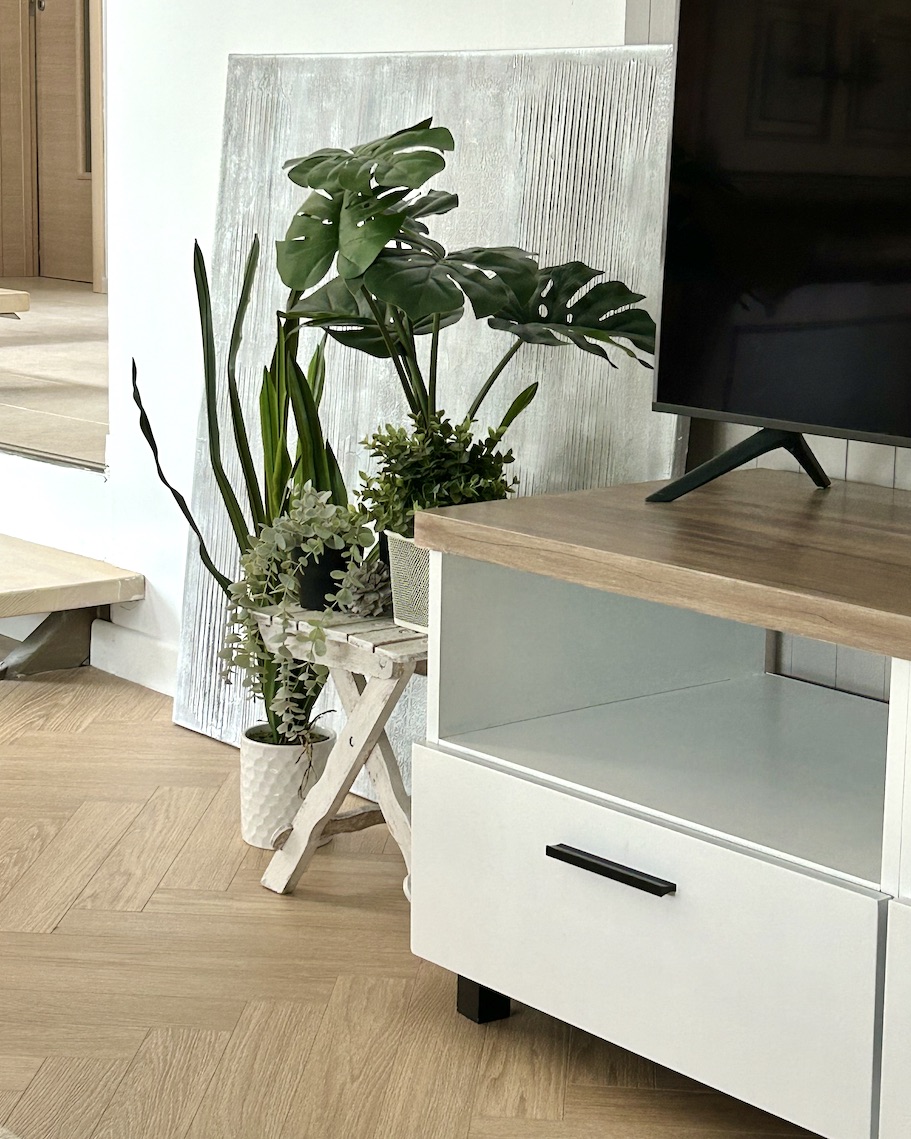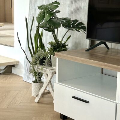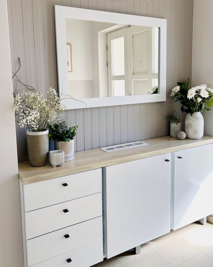 Blatul este vopsit tot cu vopseaua alba de la Oskar in care am adaugat pigmenti de la vopseaua lavabila de perete. Las link de la comoda TV, similar am facut si acolo blatul.